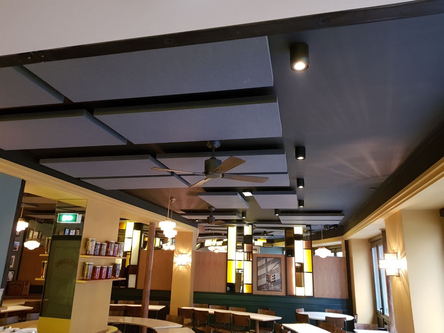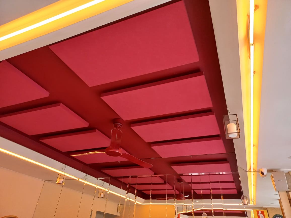 - 2.Panneaux Acoustiques de Plafond : Les panneaux acoustiques suspendus au plafond aident à contrôler les échos et à réduire le bruit dans l’espace. Ils sont particulièrement efficaces dans les restaurants avec des plafonds hauts où le son a tendance à rebondir.